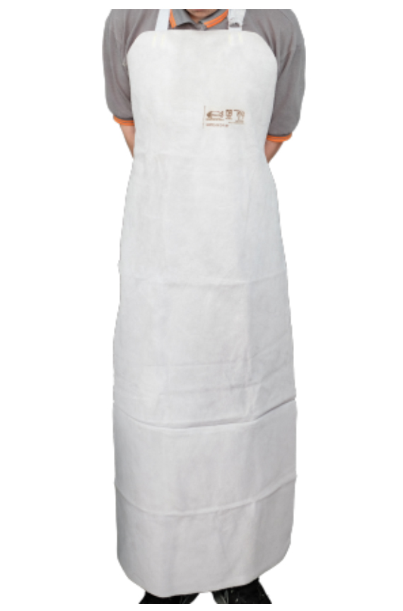 Avental de segurança confeccionado em raspa com emenda, alças em raspa com costura reforçada em aramida e fechamento de fivela metálica.